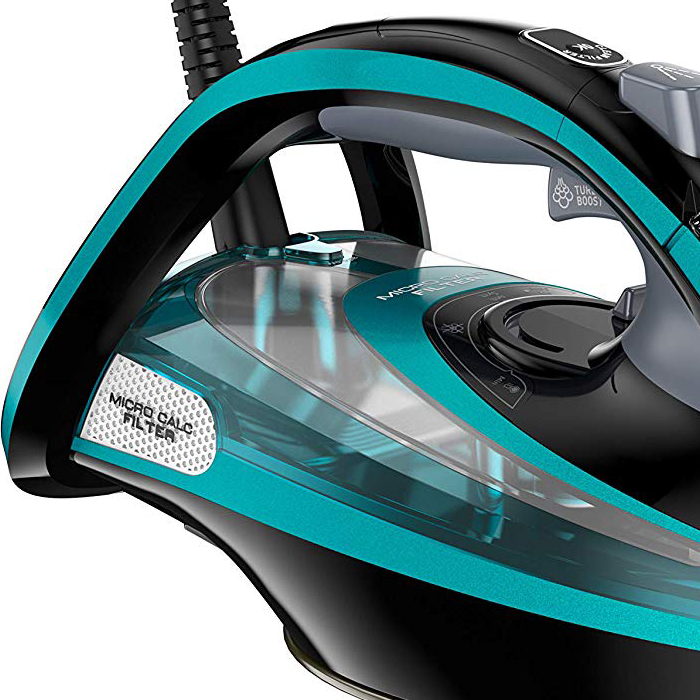 اتو بخار تفال مدل FV9844 دارای ظاهر بسیار زیبا و لوکس با بدنهای از جنس پلاستیک ABS است. یعنی در برابر ضربه، آسیب و حتی رطوبت، مقاومت بالایی از خود نشان میدهد و دوام بالایی دارد. رنگ بدنه، ترکیبی از آبی بسیار خوشرنگ (Maldives Blue) و مشکی میباشد که بسیار شیک و چشمنواز است. بنابراین توجه هر خریدار مشکلپسندی را در همان نگاه اول به خود جلب خواهد کرد. با وجود دستهی ارگونومیک و وزن نسبتاً سبک اتو (۱.۸ کیلوگرم)، مشکلی در کنترل و جابجایی اتو برای شما وجود نخواهد داشت. ماشههای آبپاش و بخارپاش و کلید اسلایدی تنظیم بخار را ببینید که چطور به شکلی حرفهای روی دستهی اتو بخار سوار شدند. مخزن شفاف آب و و ولوم تنظیم دمایی که روی آن قرار دارد، در زیر دستهی آرگونومیک قابل مشاهده هستند.