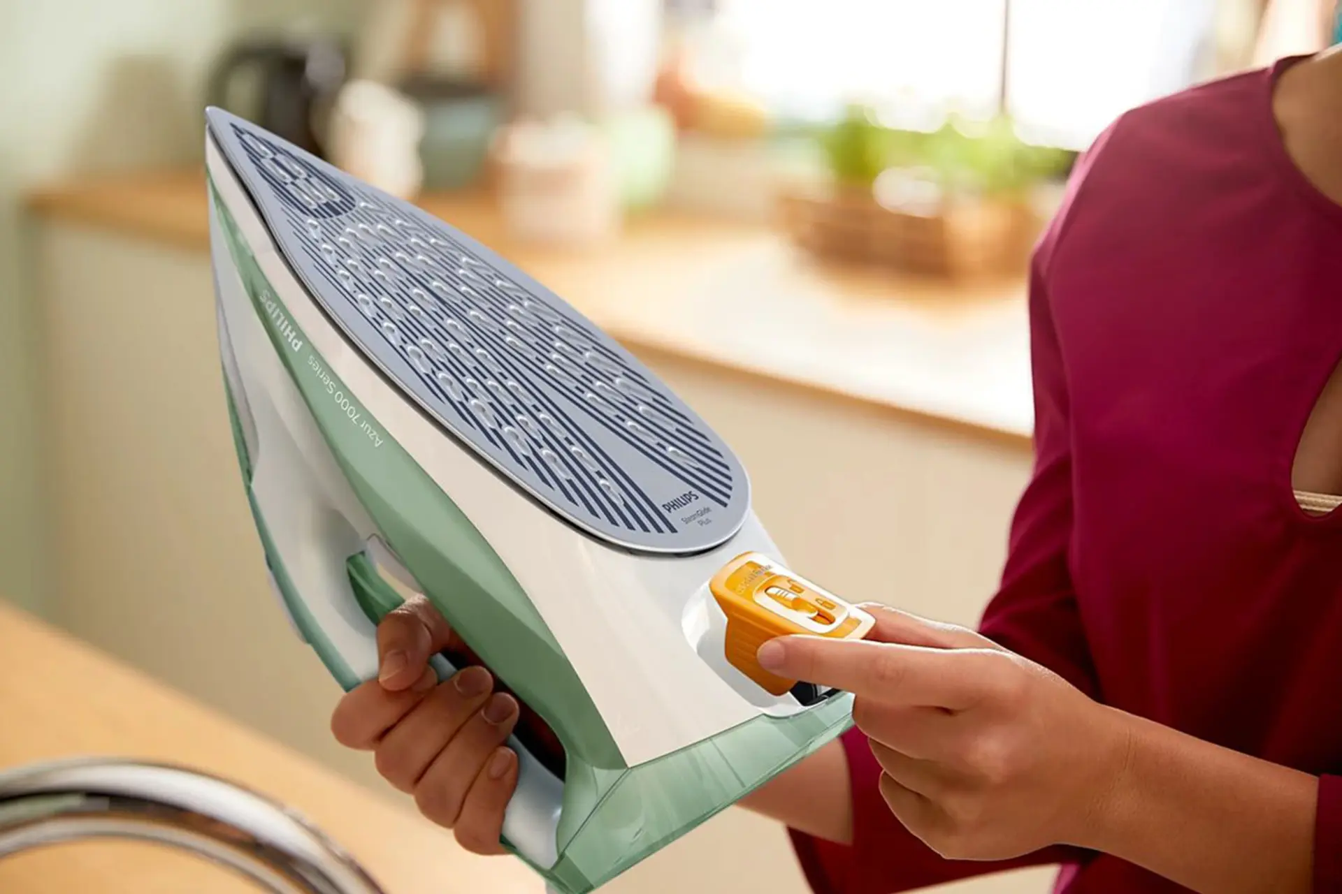 کفی اتو از جنس استیم گلاید پلاس SteamGlide Plus بوده که در برابر خط و خش مقاومت خوبی را از خود نشان می دهد. علاوه بر این حرکت نرم کفی ‌روی پارچه تجربه اتوکشی سریع و راحتی را به ارمغان می آورد.