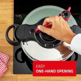 با کمک سیستم باز و بسته کردن درب که در این مدل از زودپز های ساخت شرکت تفال فرانسه در نظر گرفته شده است شما ساده ترین روش را برای باز و بسته کردن درب ان در پیش رو خواهید داشت.                                                                                                                            این زود پز را می تواند فقط یا یک دست و بالا و یا پایین اوردن دسته مرکزی ان به راحتی باز و یا بسته کنید.زودپز6لیتری تفال مدلCLIPSO MINUT EASY