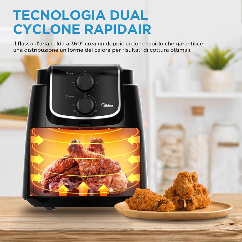 فناوری Dual Cyclone Rapid Hot Air در سرخ کن میدیا مدل MF-TN35D2 با توزیع یکنواخت و سریع هوای گرم در محفظه پخت، تضمین می‌کند که غذاها به طور کامل و یکنواخت پخته شوند. این فناوری نه تنها موجب کاهش زمان پخت می‌شود بلکه غذا را با حفظ بافت و طعم عالی، ترد و مغزپخت می‌کند.