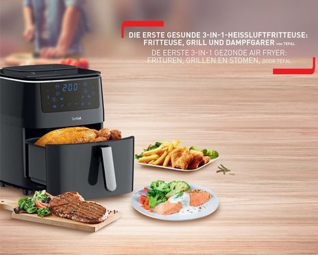 سرخ کن تفال مدل FW2018 با قدرت 1700 وات و سه عملکرد فوق العاده سرخ کن با هوا، گریل و بخارپز از گزینه های بی پایان برای آشپزی سالم و خوشمزه لذت ببرید و طیف وسیعی از غذاها را که همه دوست خواهند داشت، تهیه کنید.
