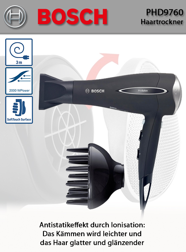 سشوار مو بوش PHD9760 با موتور کم صدای 2000 واتی AC، دارای فناوری تولید یون و باد سرد است. تکنولوژی یونیزاسیون این سشوار با ایجاد یون های منفی مانع از  وز شدن و ایجاد الکتریسیته در موها شده و همچنین باعث حفظ لطافت و درخشندگی آنها میشود. همراه این دستگاه دو سری ارائه شده که هرکدام کاربرد خاص خود را دارند. سری باریک برای حالت دهی موها و سری دیسپانسر برای حجیم کردن مو، مورد استفاده قرار میگیرد. لازم به ذکر است که حرارت باد سشوار را می‌توان روی سه حالت کم، متوسط، زیاد و سرعت باد را روی دو حالت معمولی و قوی تنظیم کرد.