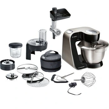 وسایل جانبی و امکاناتی که این غذاساز چند منظوره بوش دارد، نیاز شما را به داشتن وسایل برقی تک دیگر کاهش می دهد. ماشین آشپزخانه بوش مدل MUM57B224 ویژگی های بسیار فوق العاده ای دارد که در اینجا به برخی از آن ها اشاره می کنیم، این مدل از غذاساز در میان انواع دیگر موجود در بازار دارای قدرت ویژه و به قول خودمانی ریزه کاری های بسیاری است، مخلوط کن سه بعدی Multi-motion-Drive در این ماشین آشپزخانه بوش، نهایت لمس با کیفیت ترین مخلوط را به شما خواهد داد، این دستگاه دارای بازوی چندکاره با دنده های ویژه به همراه 3 تنظیم مختلف سرعت برای انتقال بهینه قدرت است که توانسته لقب حرفه ای را به این مدل پرفروش بدهد، دیگر لازم نیست نگران پاشیدن مواد به بیرون دستگاه باشید چراکه درپوش شفاف با دریچه ورودی مواد و شروع آرام در این مدل حرفه ای غذاساز، این مسئله را نیز برای شما حل کرده است.