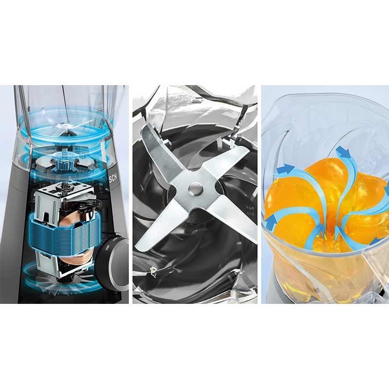 این دستگاه از یک موتور قدرتمند برخوردار است که توان مصرفی آن 1200 وات و حداکثر سرعت چرخش این موتور 30000 دور در دقیقه میباشد. این دستگاه از قابلیت تنظیم سرعت با توجه به نوع مواد غذایی که به وسیله آن میکس میکنید برخوردار است و شما میتوانید سرعت آن را در 2 درجه متنوع تنظیم کنید. تیغه های این مخلوط کن بوش ProEdge و ساخت آلمان میباشد و از جنس استیل ضد زنگ است که به وسیله آن میتوانید انواع مواد غذایی را به راحتی و با بهترین کیفیت میکس کنید و همچنین میتوانید آن ها را به راحتی شست و شو دهید و تمیز کنید.