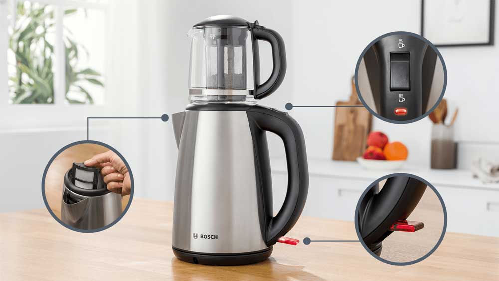 این دستگاه از طریق المنت حرارتی مخفی بر روی پایه گرم می شود، همچنین کفی داخلی کتری نیز از جنس استیل است باعث دوام و کیفیت بالای این دستگاه شده است. دکمه روشن / خاموش کردن چای ساز بوش TTA۵۶۰۳ در قسمت پایین دستگاه و دکمه گرم نگهدار در بالای دسته­ کتری قرار دارد. با عملکرد بهینه و قیمت متناسبی که دارد توانسته است در میان خریداران ایرانی اعتبار بسیار زیادی به دست آورد.