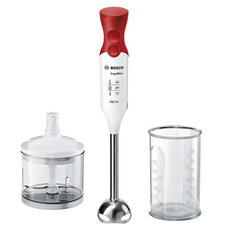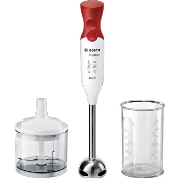 تیغه های تمام استیل ضد زنگ با قابلیت برش گوشت، سبزیجات، میوه، خشک بار، آجیل، پنیر و موارد مشابه است. طراحی فوق العاده شیکی دارد و منطبق با موازین ارگونومیک ساخته شده است همچنین ترکیبی از دو رنگ سفید و قرمز است.گوش کوب و خردکن برقی بوش قابلیت انجام چندین کار تنها با استفاده از یک موتور را دارد.